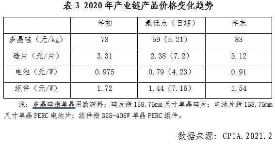 (四)產(chǎn)業(yè)鏈供給矛盾突出2020年,光伏產(chǎn)品價格經(jīng)歷了V字型起伏的過程,光伏產(chǎn)業(yè)硅料、玻璃和EVA膠膜等部分原輔材料環(huán)節(jié)出現(xiàn)的供需緊張也前所未有。上半年,受全球疫情蔓延影響,對下游應(yīng)用市場未來需求的不確定性導(dǎo)致產(chǎn)業(yè)鏈大幅降價,各環(huán)節(jié)價格降幅均在20%左右。硅料環(huán)節(jié),三季度受到事故及自然災(zāi)害等因素影響供應(yīng)緊張,8月多晶硅致密料價格由6月的59元/公斤增加至約95元/公斤,漲幅約為60%;四季度隨著新疆地區(qū)硅料企業(yè)復(fù)工,多晶硅價格回落,但仍高于二季度價格低點(diǎn)38%。EVA膠膜的生產(chǎn)設(shè)備及原材料EVA粒子可用于防疫物資生產(chǎn),2020年防疫物資需求暴漲,使得生產(chǎn)設(shè)備及EVA粒子供應(yīng)緊張,膠膜企業(yè)擴(kuò)產(chǎn)受阻延遲,在下半年需求暴漲的情況下,EVA膠膜企業(yè)只能通過大幅漲價的方式來獲取EVA粒子資源。下半年EVA膠膜價格上漲了50%,一度達(dá)到14元/平方米的高價,和POE膠膜的價格形成了倒掛。下半年需求的集中爆發(fā)導(dǎo)致光伏玻璃供給出現(xiàn)巨大缺口,價格快速上漲,年底3.2mm光伏玻璃價格達(dá)到了43元/平方米,較5-6月最低時上漲80%,部分企業(yè)采用浮法玻璃作為雙面組件的背板玻璃。進(jìn)入12月,產(chǎn)品價格趨于平緩。但全年來看,除多晶硅價格上漲13.7%以外,硅片、電池、組件產(chǎn)品價格仍分別下降了5.7%、6.7%與10.5%,降本增效發(fā)展方向沒有變,長期來看價格依然是下降趨勢。