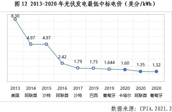 (五)光伏發(fā)電電價與成本持續(xù)下降2020年,全球光伏發(fā)電中標(biāo)電價繼續(xù)下降,僅一年中全球就有三個項(xiàng)目接連創(chuàng)造了最低中標(biāo)電價。8月,位于葡萄牙一光伏項(xiàng)目中標(biāo)電價達(dá)到了0.0112歐元/kWh(約1.32美分/kWh),折合當(dāng)時人民幣價格約0.091元/kWh。這一電價比2019年最低中標(biāo)電價降低了0.324美分/kWh,降幅達(dá)到19.7%。2020年,我國光伏發(fā)電項(xiàng)目中標(biāo)電價也刷新最低紀(jì)錄,青海海南州一光伏發(fā)電競價項(xiàng)目中標(biāo)電價為0.2427元/kWh(約3.46美分/kWh),低于2019年達(dá)拉特旗光伏項(xiàng)目0.26元/kWh的電價。除此之外,卡塔爾、阿聯(lián)酋、印度等國光伏中標(biāo)電價也打破了原來的最低紀(jì)錄。光伏發(fā)電價格已經(jīng)在全球越來越多的國家及地區(qū)低于火電,成為了最具競爭力的電力產(chǎn)品。