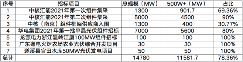 近日以來,以中核、華電為代表的央國企已經(jīng)開啟或完成2021年第一批次的光伏組件設(shè)備招標(biāo)工作,根據(jù)招標(biāo)要求發(fā)現(xiàn),大尺寸組件的需求已進(jìn)入白熱化階段。