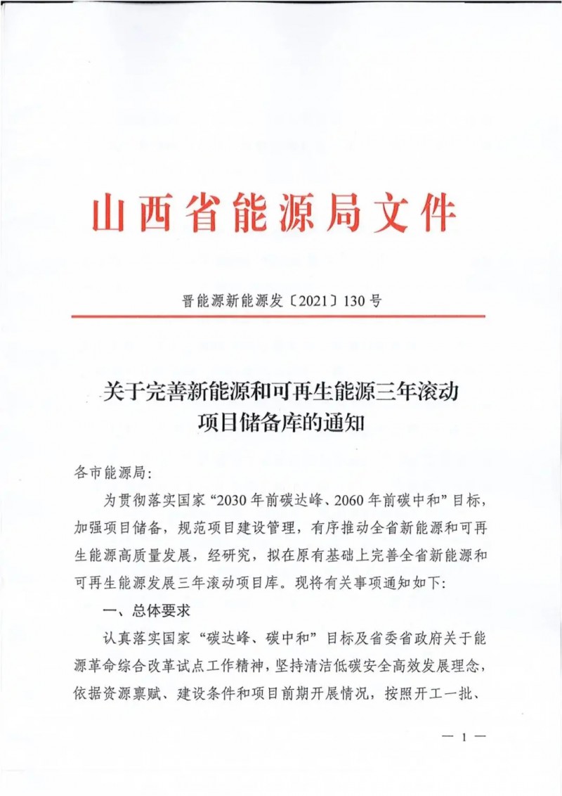 根據(jù)文件,為落實雙碳目標(biāo)以及省委省政府關(guān)于能源革命綜合改革試點工作,按照開工一批、謀劃一批、儲備一批的思路,建設(shè)完善三年滾動項目儲備庫。(左右滑動查看文件)