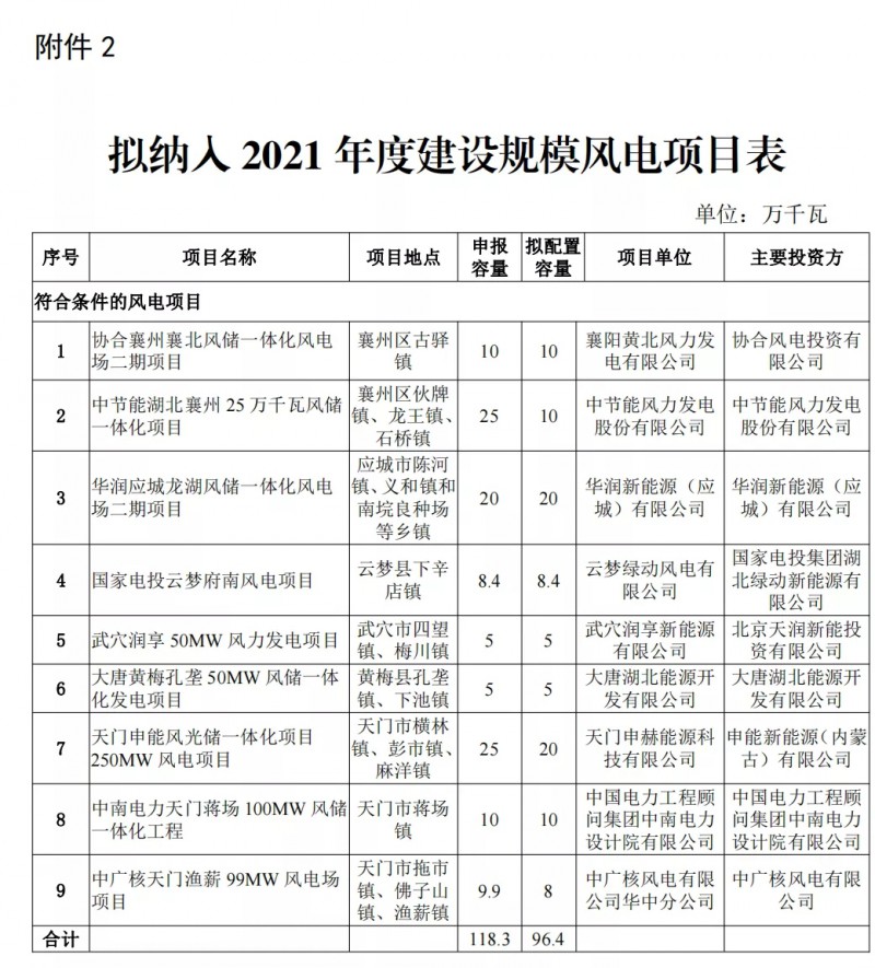 2)9個風(fēng)電項(xiàng)目,總規(guī)模118.3萬千瓦 ,擬配置規(guī)模96.4萬千瓦;