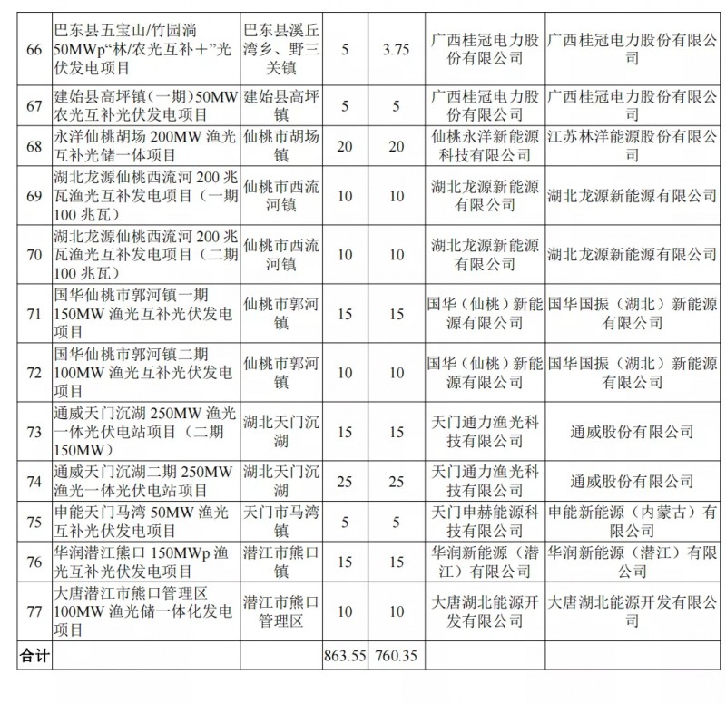 3)77個平價(jià)光伏項(xiàng)目,總規(guī)模863.55萬千瓦 ,擬配置規(guī)模760.35萬千瓦;