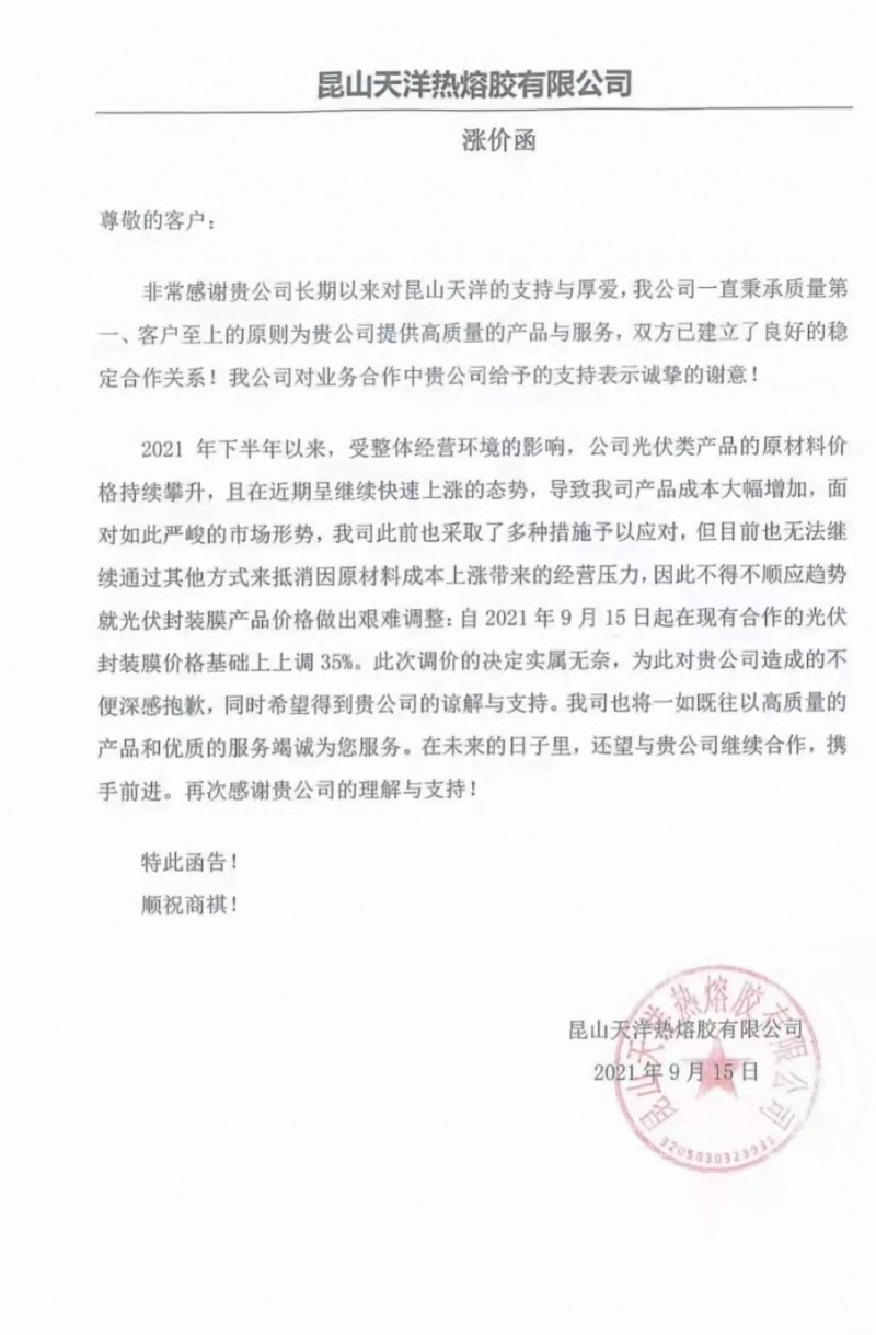 其中,昆山天洋熱熔膠有限公司宣布自9月15日起在現(xiàn)有合作的光伏封裝膜價(jià)格基礎(chǔ)上上調(diào)35%;上海海優(yōu)威宣布自9月15日到貨(含當(dāng)日)起在現(xiàn)有合作的膠膜價(jià)格上調(diào)漲35%以上。
