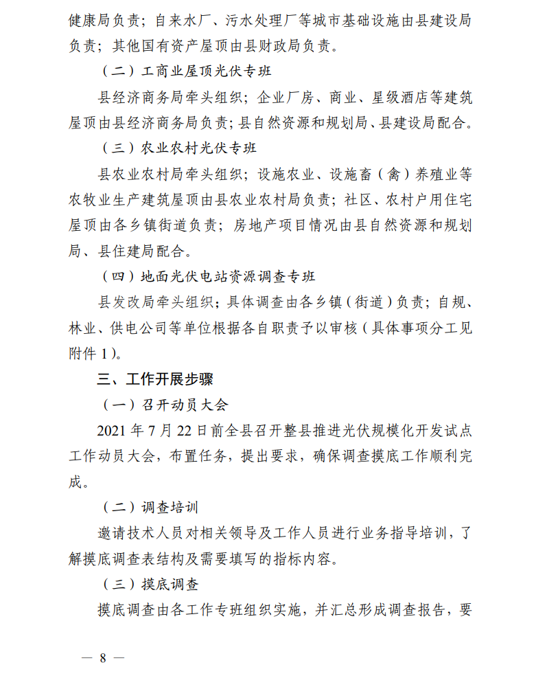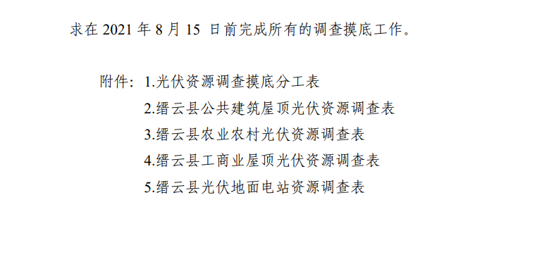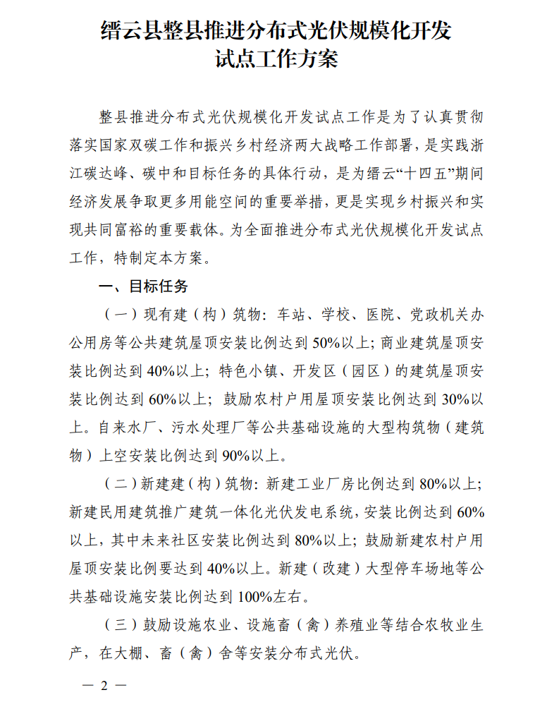 日前,縉云縣人民政府辦公室發(fā)布關(guān)于印發(fā)《縉云縣整縣推進分布式光伏規(guī)?;_發(fā)試點工作方案》《縉云縣分布式光伏資源調(diào)查摸底工作方案》的通知。通知明確,縉云縣整縣推進分布式光伏規(guī)?;_發(fā)試點工作目標任務(wù)為: