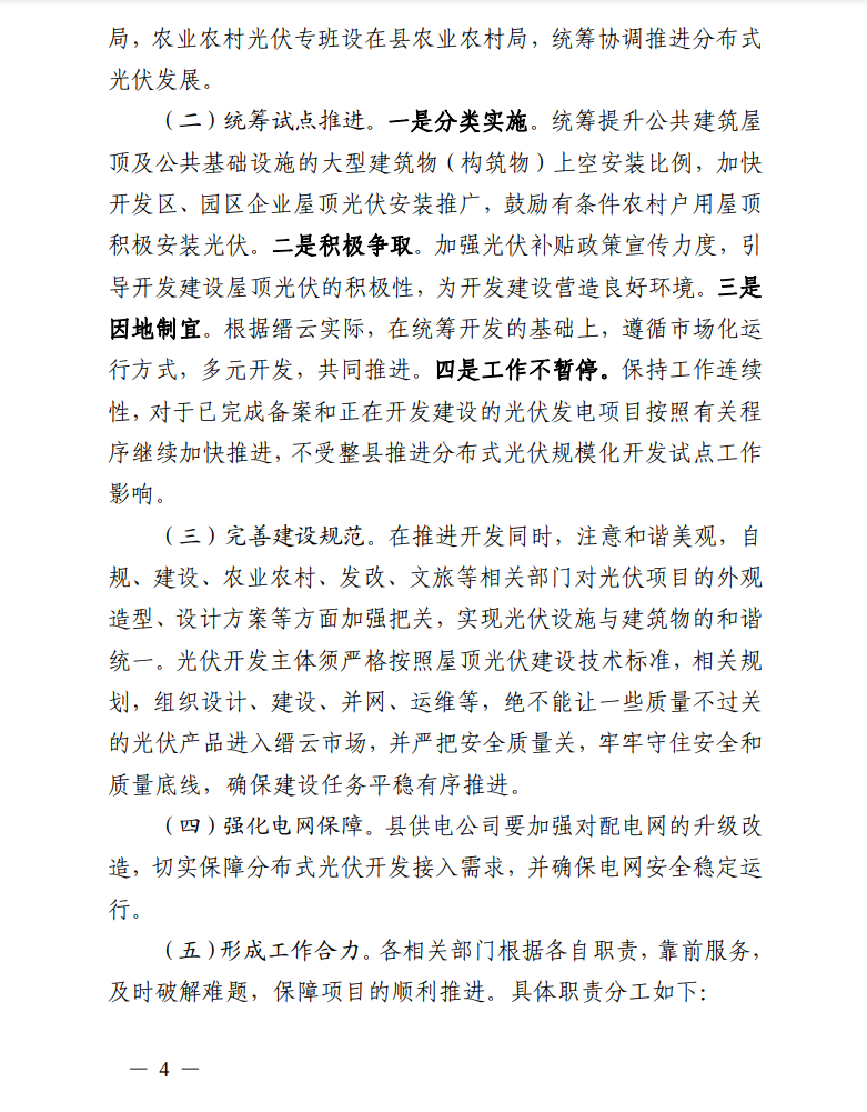 四是工作不暫停。保持工作連續(xù)性,對于已完成備案和正在開發(fā)建設(shè)的光伏發(fā)電項目按照有關(guān)程序繼續(xù)加快推進,不受整縣推進分布式光伏規(guī)?;_發(fā)試點工作影響。