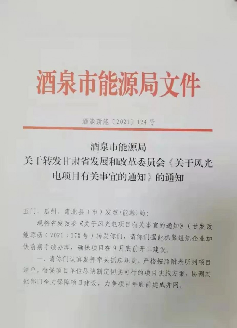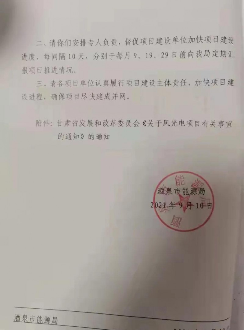 酒泉市能源局也下發(fā)相應(yīng)文件要求項目在9月底前開工建設(shè)每間隔10天,在每月的9日、19日、29日向酒泉能源局定期匯報項目推進(jìn)情況,加快項目建設(shè)進(jìn)程,確保項目盡快建成并網(wǎng)。