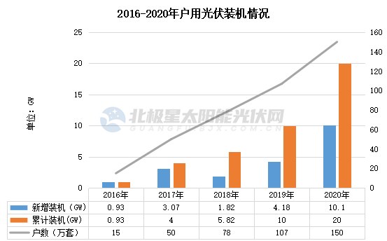 根據(jù)國(guó)家能源局公布的數(shù)據(jù),2019年戶用光伏實(shí)際新增裝機(jī)達(dá)到4.18GW。占全國(guó)裝機(jī)17.6%,成為2019年新增裝機(jī)中的亮點(diǎn)。2020年戶用光伏表現(xiàn)的更為“搶眼”,新增裝機(jī)規(guī)模達(dá)到了10.1GW,占總裝機(jī)的21%,占分布式光伏的67%。