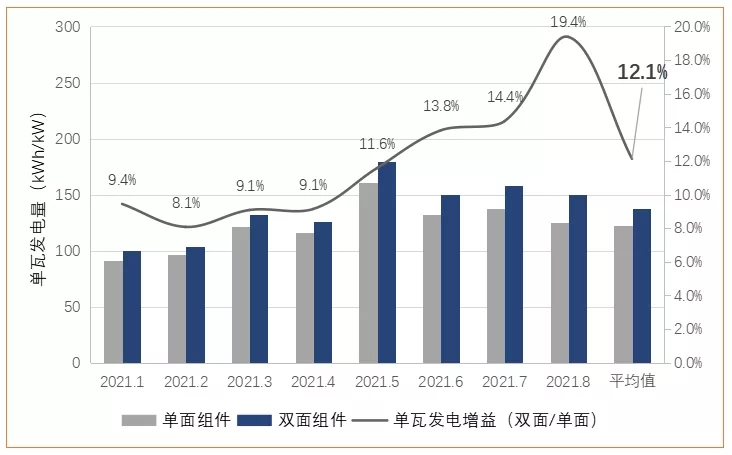 我們獲取了該項目從2021年1月到2021年8月共計8個月的發(fā)電數(shù)據(jù),為了評估項目的發(fā)電效果,選取了鄰近305Wp常規(guī)單晶組件的電站做參照。通過兩個電站各月單瓦發(fā)電量的對比,隆基雙面組件相比常規(guī)單晶組件每瓦發(fā)電量高12.1%。