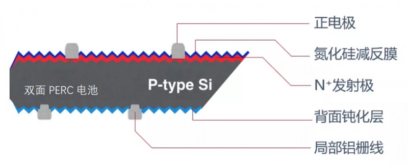 目前主流的雙面組件都采用了雙面PERC電池,相比單面PERC電池,其背面采用局部鋁柵線代替全覆蓋的背鋁,使電池具有背面發(fā)電的能力,正、背面均可以收集電流,從而可實現(xiàn)雙面發(fā)電。