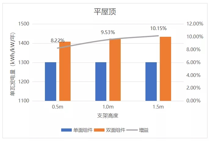 可以看到,在水泥平屋頂,雙面組件的支架高度1m時,首年增益接近10%;隨著支架高度的增加,增益略有增高。