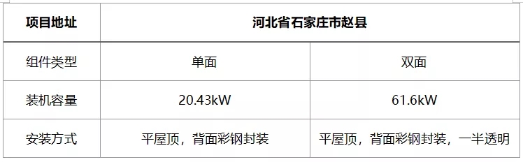 位于河北省石家莊趙縣一處居民平屋頂項目,安裝了雙面組件后同樣表現(xiàn)出很好的發(fā)電性能。由于居民屋頂為水泥屋頂,同時背面用彩鋼瓦封裝,選用了隆基PERC雙面組件,總裝機容量達61.6kWp。項目具體信息如下: