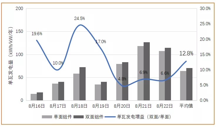 假設系統(tǒng)成本3.5元/W,在相同回收期的前提下,這部分多發(fā)電的價值可折算為3.5元/W*1.3%=0.45元/W,也即雙面組件可實現(xiàn)4.5分/W的溢價。