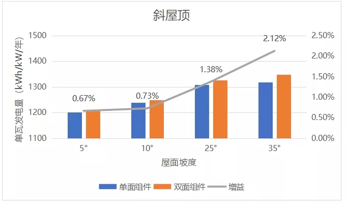可以看到,在彩鋼瓦屋面平鋪時(5°~10°的坡度),雙面首年增益有0.7%左右;在斜屋頂平鋪時(25°~35°的坡度),雙面首年增益約1%~2%
