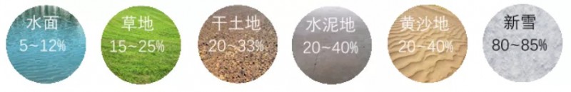 反射率:沙地/水泥地>土地>草地>水面,大致的反射率可參考下圖,其中水泥地面的反射率在20%~40%之間;