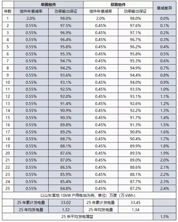 所以雙面組件相比單面組件有0.1%的逐年衰減優(yōu)勢,以山東10kW電站為例,25年平均多發(fā)電1.3%。