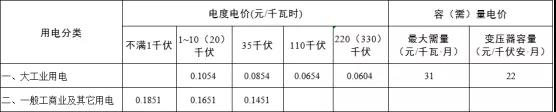 注:1.表中各電價含增值稅、線損、交叉補貼及區(qū)域電網(wǎng)容量電價,不含政府性基金及附加。2.政府性基金及附加標準分別為農(nóng)網(wǎng)還貸資金2分/千瓦時、國家重大水利工程建設(shè)基金0.1125分/千瓦時、可再生能源電價附加1.9分/千瓦時、大中型水庫移民后期扶持基金0.62分/千瓦時。3.110千伏及以上“網(wǎng)對網(wǎng)”外送電省外購電用戶承擔(dān)的送出省平均輸電價格為每千瓦時不超過0.022元(含稅、含線損、下同),最高不超過每千瓦時0.03元。4.變壓器容量在315千伏安及以上的一般工商業(yè)及其他用戶可選擇執(zhí)行表中大工業(yè)生產(chǎn)用電兩部制電價。