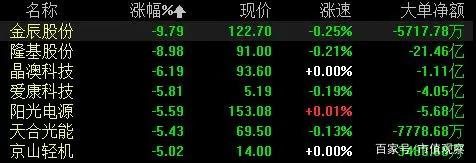 盤面顯示,金辰股份(603396)一度大跌10%,尾盤小幅拉升收跌9.79%,一日蒸發(fā)15.4億元。此外,陽(yáng)光電源(300274)等6只概念股跌超5%。