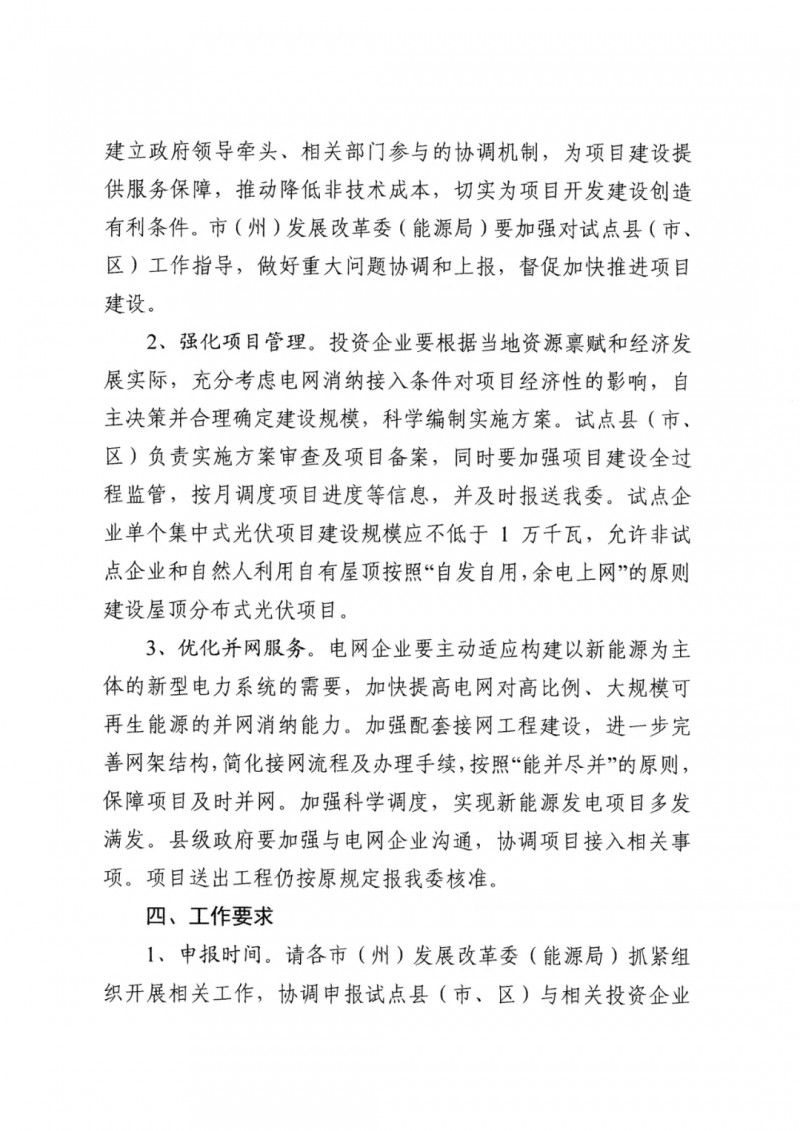 已納入國家試點的12個整縣屋頂分布式光伏試點縣,如縣(市、區(qū))政府和原開發(fā)企業(yè)按要求達成合作并按時上報相關(guān)材料的,可將試點范圍擴大至含地面分布式和集中式在內(nèi)的全部光伏項目,一并納入試點范圍。