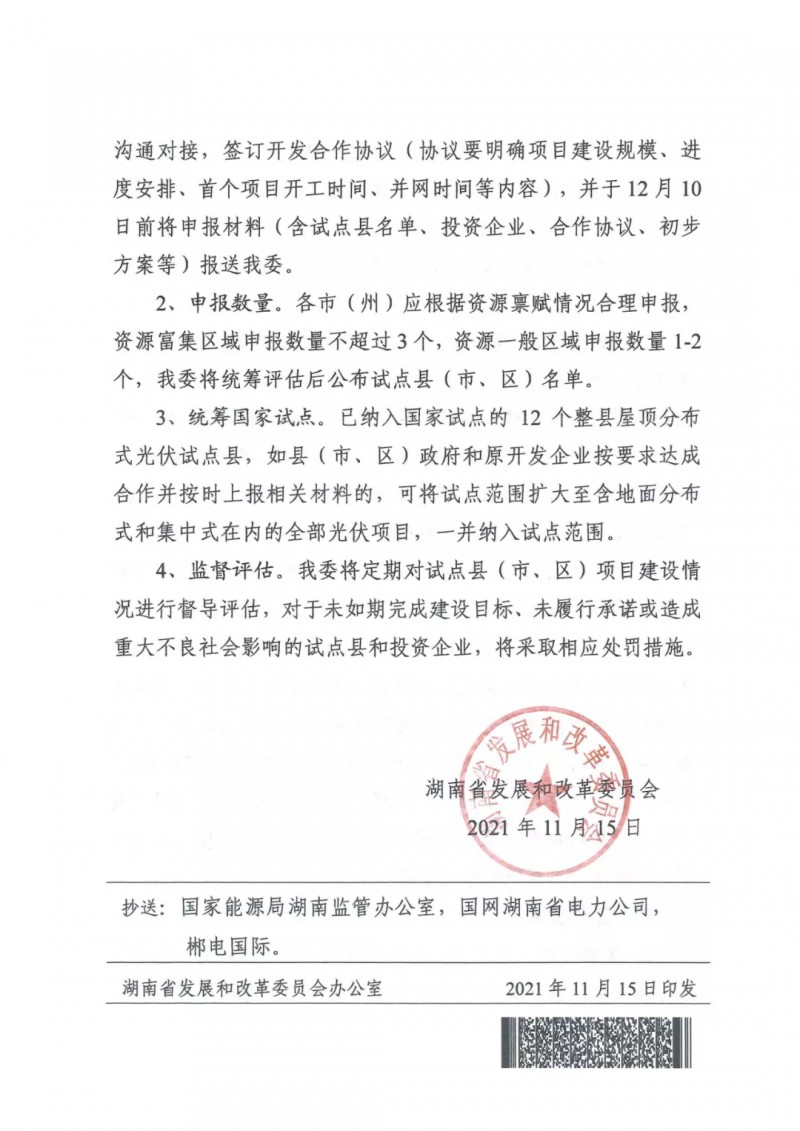 11月15日,湖南省發(fā)改委下發(fā)《關(guān)于開展整縣(市、區(qū))光伏開發(fā)試點的通知》,擬在全省范圍內(nèi)組織推進一批整縣(市、區(qū))光伏開發(fā)試點,高效整合縣域資源,結(jié)合多能互補協(xié)同發(fā)展。