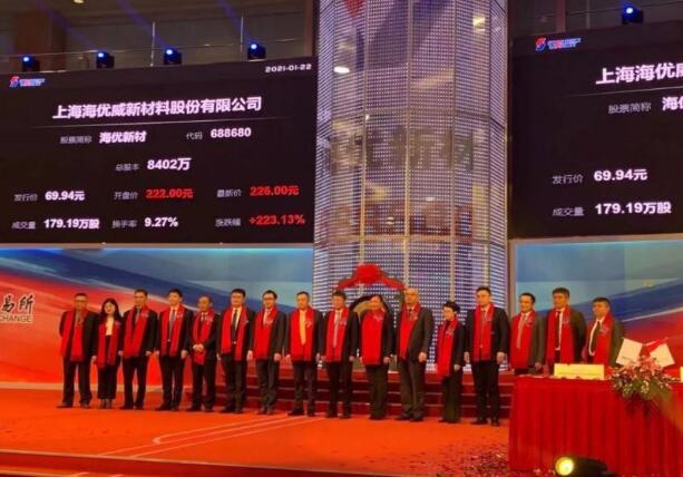 國內(nèi)光伏膠膜的領軍型企業(yè)---海優(yōu)新材在科創(chuàng)板正式上市。該公司今天開盤價格為200元以上,截至發(fā)稿時報價為218元,漲幅為211.7%。這一漲幅在去年至今的所有新能源A股、科創(chuàng)板漲幅中非常之高。