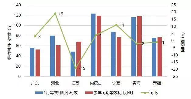 由以上圖可以看出,2019年1月,除河北、江蘇、寧夏外,其他省份的利用小時(shí)數(shù)均與去年同期相差不大。江蘇的平均等效利用小時(shí)數(shù)較去年同期同比減少最多,達(dá)19小時(shí)!河北的平均等效利用小時(shí)數(shù)較去年同期同比增加19小時(shí),寧夏的平均等效利用小時(shí)數(shù)較去年同期同比增加11小時(shí)。