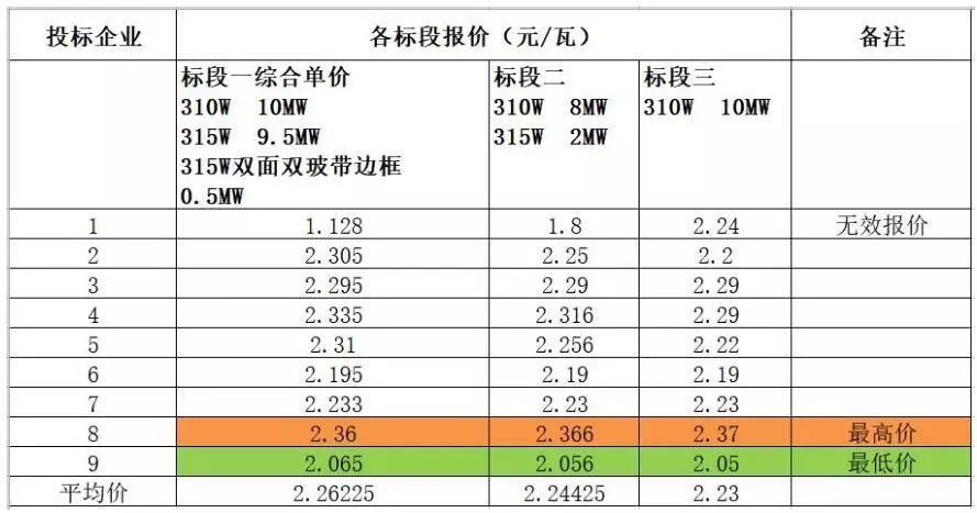 從開標(biāo)價(jià)格可以看出,除去無效報(bào)價(jià),三個(gè)標(biāo)段的最低價(jià)格為2.05元/瓦,最高報(bào)價(jià)為2.37元/瓦,平均價(jià)格集中在2.2-2.3元/瓦。