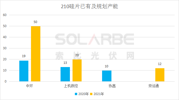 2021年中環(huán)G12硅片產(chǎn)能將從19GW提升至50GW,目前中環(huán)210產(chǎn)品規(guī)模化生產(chǎn)良率已超95%,一月份中環(huán)210硅片出貨將超1.4GW,市占率高達(dá)99.5%。2020年11月4日,京運(yùn)通宣布投資70 億元在樂山建設(shè)24GW單晶項(xiàng)目,適配210mm硅片生產(chǎn)線,一期12GW計(jì)劃于2020年第四季度開工建設(shè)。