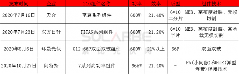 回顧2020年,天合、東方日升、環(huán)晟光伏、阿特斯先后發(fā)布了搭載210尺寸硅片的超高功率組件。2020年3月份,東方日升斬獲全球首個(gè)210尺寸500W組件訂單,成功打進(jìn)歐洲市場,并打響了210組件訂單的第一槍。截止2020年第三季度,天合210組件簽單1GW,2021年1月8日,天合與美國公司NEXTERA ENERGY(新時(shí)代能源)再簽4GW的210組件長單。
