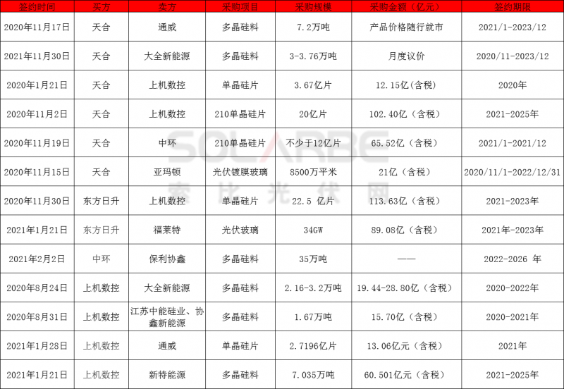 為保證210產(chǎn)品正常供應(yīng),天合、東方日升、中環(huán)紛紛簽訂多晶硅料、硅片以及光伏玻璃長單。