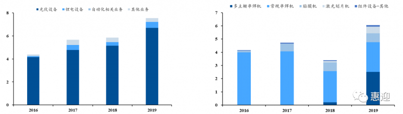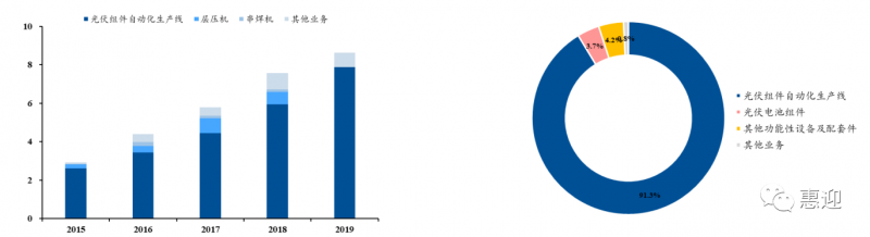 多主柵串焊機(jī)逐步成為公司光伏設(shè)備中的主要構(gòu)成產(chǎn)品。2018 年,公司多主柵串焊機(jī)開始放量,在公司光伏設(shè)備收入中占比約為 5.88%,2019 年,公司多主柵串焊機(jī)收入從 0.2 億元提升至 2.52 億元,占光伏設(shè)備收入中的 40.91%,超越常規(guī)串焊機(jī),成為公司光伏設(shè)備業(yè)務(wù)中占比最高的業(yè)務(wù),成為公司的營業(yè)收入中占比最高的業(yè)務(wù)。未來,公司的串焊機(jī)有望深度受益于光伏組件技術(shù)迭代,在新一輪市場擴(kuò)展中占據(jù)優(yōu)勢(shì)地位。