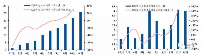 2020 年,我國新增光伏裝機(jī)量為 48.2GW,同比增長 81.7%,超過年內(nèi)各機(jī)構(gòu)預(yù)期。根據(jù)中電聯(lián)的數(shù)據(jù),我國光伏新增裝機(jī)量已在 2020 年下半年走出疫情的影響,光伏裝機(jī)量從 8 月份恢復(fù)至 19 年同期水平,10 月份新增的累計(jì)裝機(jī)量同比已實(shí)現(xiàn) 20%正增長,單月新增裝機(jī)規(guī)模超過 4GW,同比增長率高達(dá)300%。