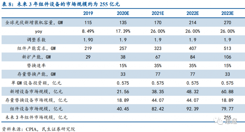 經(jīng)民生證券測算,預(yù)計(jì) 2021 年、2022 年、2023 年組件設(shè)備的市場規(guī)模可分別達(dá)到 82.42 億元、92.39 億元和 79.77 億元,未來 3 年組件設(shè)備的市場規(guī)模合計(jì)可達(dá) 255 億元,組件設(shè)備廠商擁有廣闊的發(fā)展前景。