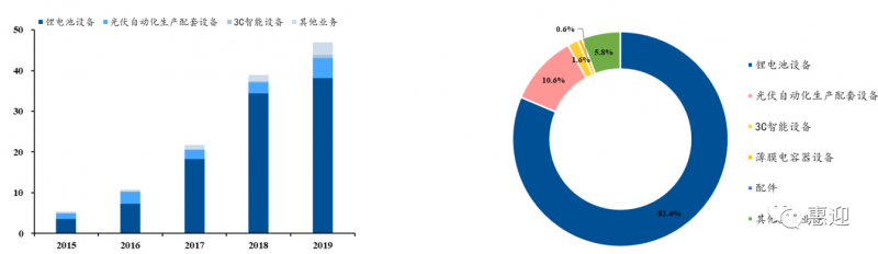 公司作為平臺(tái)型公司,營業(yè)收入和歸母凈利潤的體量較大,2019 年公司的營業(yè)收入和歸母凈利潤已分別達(dá)到 48.84 億元和 7.66 億元,同比增長 20.41%和 3.23%。其中,隨著近年來伏景氣度的提振,光伏設(shè)備在公司業(yè)務(wù)的占比中有所恢復(fù),2015-2019 年,公司光伏自動(dòng)化生產(chǎn)配套設(shè)備的營業(yè)收入從 1.4 億增長至 4.95 億元,CAGR 為 31.13%。截止 2020 年第三季度,公司合同負(fù)債金額為 15.01 億元,相比 2019 年末提升 89.86%,主要原因?yàn)閳?bào)告期新增訂單較多,預(yù)收款項(xiàng)增加。根據(jù) 2020 年中報(bào)披露,光伏自動(dòng)化生產(chǎn)配套設(shè)備占公司總營收的 12.54%。