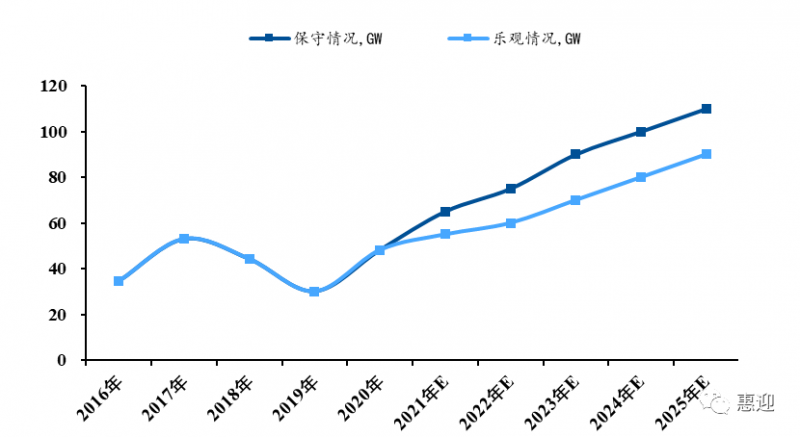 在中國向“30·60目標(biāo)”邁進(jìn)的過程中,“十四五”是實(shí)現(xiàn)碳達(dá)峰的關(guān)鍵時(shí)期,光伏發(fā)電大有可為。根據(jù) CPIA的觀察與分析,預(yù)計(jì) 2021 年新增裝機(jī)規(guī)模約為 55GW-65GW,預(yù)計(jì)“十四五”期間,國內(nèi)年均光伏新增裝機(jī)規(guī)模將達(dá) 70-90GW。由此推算,未來 5 年,光伏新增總裝機(jī)規(guī)模有望達(dá)到 350-450GW,同比“十三五”期間 210GW 的新增總裝機(jī)規(guī)模有較大幅度提升。