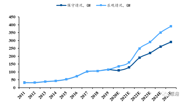 光伏行業(yè)降本提效穩(wěn)步推進(jìn),疊加全球各國可再生能源政策的頒布與執(zhí)行,預(yù)計(jì)全球光伏累計(jì)裝機(jī)容量將繼續(xù)保持增長態(tài)勢(shì),根據(jù) CPIA 的預(yù)測,“十四五”期間,樂觀預(yù)期下,全球光伏裝機(jī)規(guī)模年均新增 287GW,中性情況下年均新增 222GW。該預(yù)期與 IRENA 于 2019 年年在分析報(bào)告《光伏的未來》給出的預(yù)測基本一致,IRENA 認(rèn)為,到 2030 年光伏的裝機(jī)目標(biāo)將達(dá)到 8500GW,年均光伏新增規(guī)模將超過 250GW。