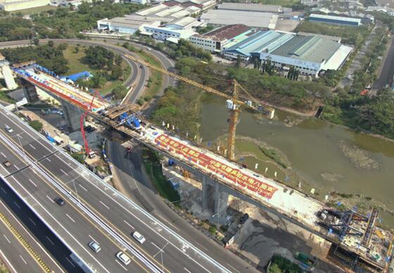 全長142.3公里的雅萬高鐵,正線80%以上設計為橋梁,其中大多數(shù)采用標準的預制箱梁連接。在跨越既有的公路、鐵路和河流等障礙的線路上,不少橋梁段采用了現(xiàn)澆工藝的連續(xù)梁施工。由水電八局承建的2號特大橋全長36公里,就有25處設計采用連續(xù)梁形式跨越立交橋、高速公路互通匝道及河流。這里的連續(xù)梁密度之高,施工難度之大,高鐵建筑史上罕見。因此,連續(xù)梁施工成為水電八局管段內最重要的施工內容之一。