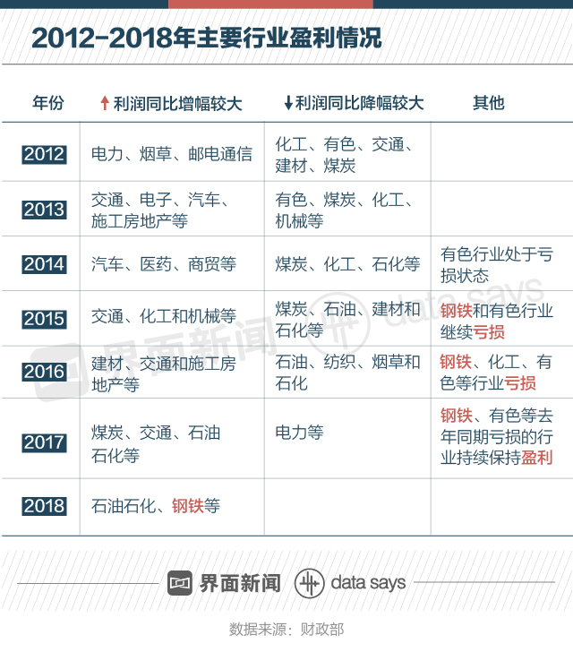 從盈利行業(yè)情況來看,2018年,財(cái)政部報(bào)告中所列利潤(rùn)同比增幅較大行業(yè)僅有石油石化、鋼鐵2個(gè)。