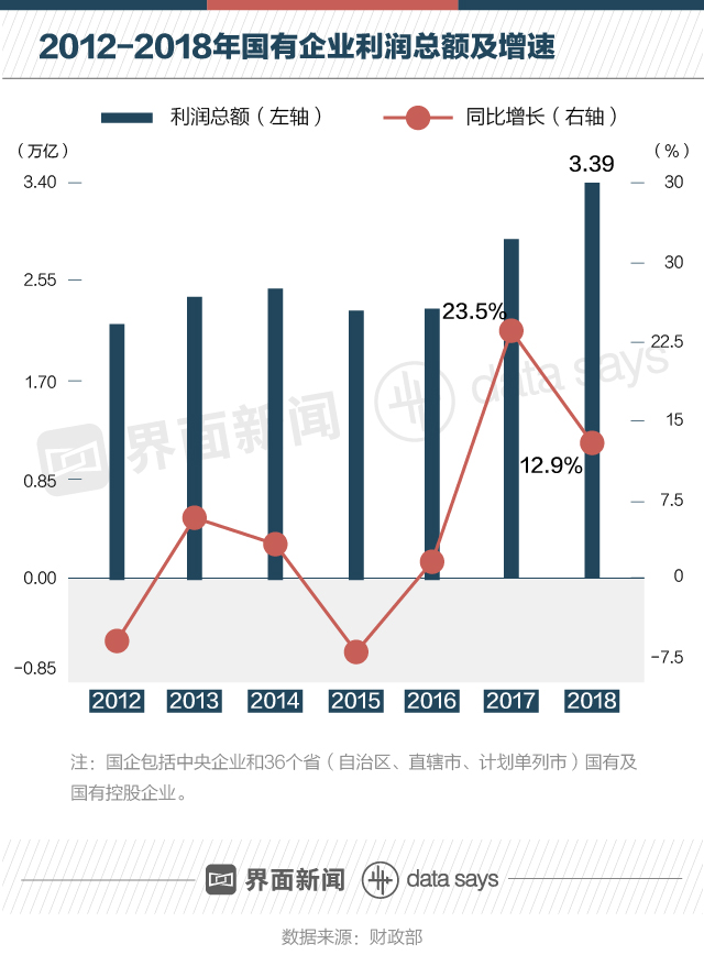 財(cái)政部數(shù)據(jù)顯示,2012年以來,國(guó)有企業(yè)利潤(rùn)額總體保持增長(zhǎng)勢(shì)頭。2015年國(guó)企利潤(rùn)總額小幅下跌后,在2016年開始回升,并在2017年實(shí)現(xiàn)大幅反彈。2018年國(guó)企利潤(rùn)總額達(dá)3.39萬(wàn)億,創(chuàng)歷史新高。