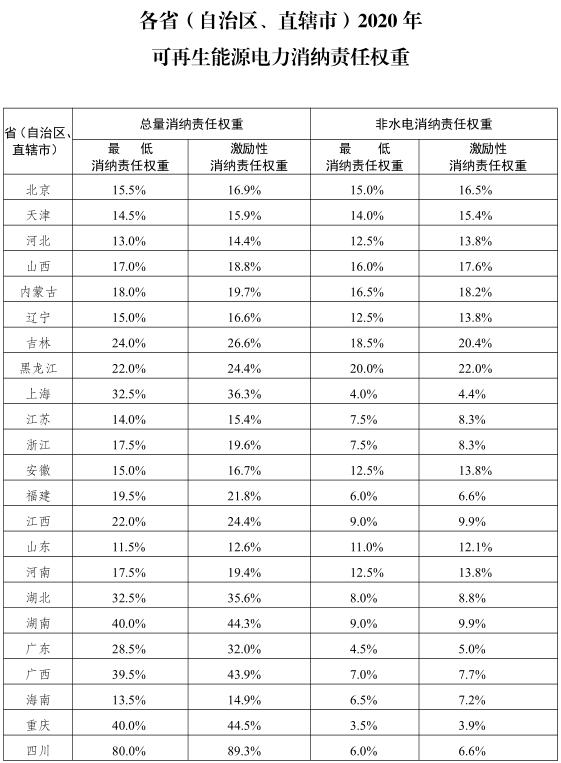 根據(jù)《國家發(fā)展改革委 國家能源局關(guān)于建立健全可再生能源電力消納保障機制的通知》(發(fā)改能源〔2019〕807號),在各地測算的基礎(chǔ)上,我們統(tǒng)籌提出了各省級行政區(qū)域2020年可再生能源電力消納責(zé)任權(quán)重,現(xiàn)印發(fā)你們,請認(rèn)真組織落實。