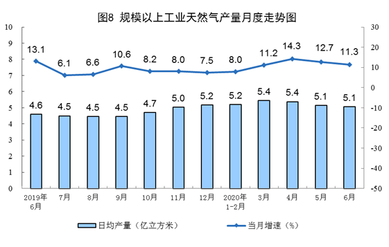 天然氣生產(chǎn)保持較快增長。6月份,生產(chǎn)天然氣152億立方米,同比增長11.3%,增速比上月回落1.4個百分點,日均產(chǎn)量5.1億立方米。上半年,生產(chǎn)天然氣940億立方米,同比增長10.3%,比一季度加快1.2個百分點。