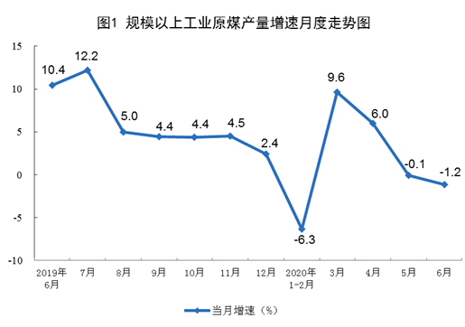 原煤生產(chǎn)小幅下降。6月份,生產(chǎn)原煤3.3億噸,同比下降1.2%,降幅比上月擴(kuò)大1.1個百分點;日均產(chǎn)量1114萬噸,環(huán)比增加86萬噸。上半年,生產(chǎn)原煤18.1億噸,同比增長0.6%,一季度為下降0.5%。
