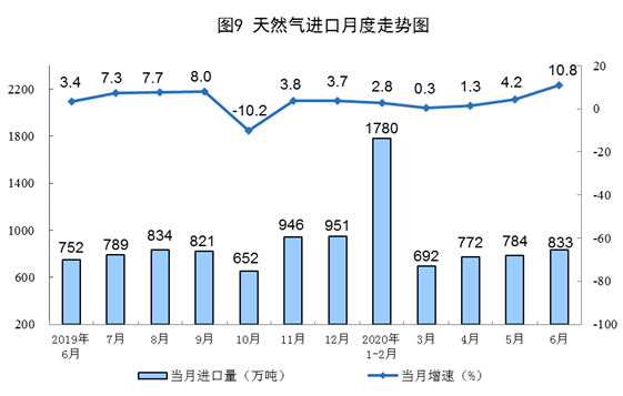 天然氣進(jìn)口增長明顯加快。6月份,進(jìn)口天然氣833萬噸,同比增長10.8%,增速比上月加快6.6個百分點。上半年,進(jìn)口天然氣4836萬噸,同比增長3.3%,比一季度加快1.5個百分點。