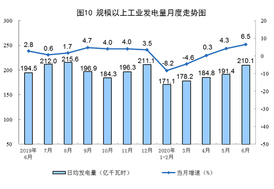 電力生產(chǎn)繼續(xù)加快。6月份,發(fā)電量6304億千瓦時,同比增長6.5%,增速比上月加快2.2個百分點;日均發(fā)電量210.1億千瓦時,環(huán)比增加18.7億千瓦時。上半年,發(fā)電量33645億千瓦時,同比下降1.4%,降幅比一季度收窄5.4個百分點。