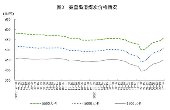 港口煤炭綜合交易價格持續(xù)回升。7月3日,秦皇島港5500大卡、5000大卡和4500大卡煤炭價格分別為每噸556元、506元和450元,比5月29日回升28元、33元和28元。