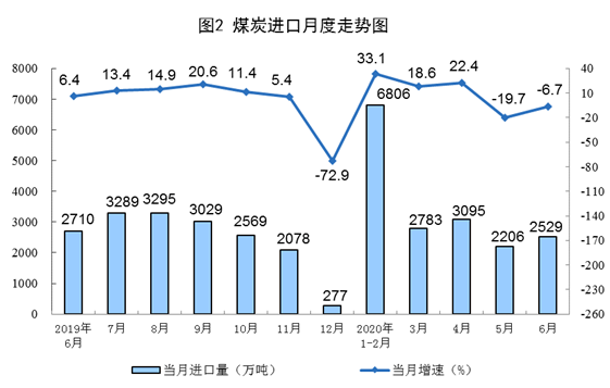 煤炭進(jìn)口下降。6月份,進(jìn)口煤炭2529萬噸,環(huán)比增加323萬噸,同比下降6.7%;上半年,進(jìn)口煤炭1.74億噸,同比增長12.7%,比一季度回落15.7個百分點。