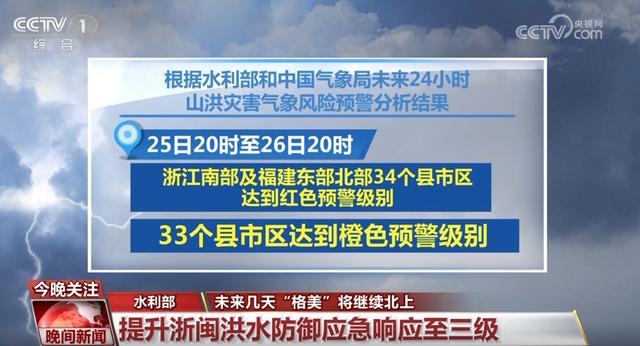 根據(jù)水利部和中國氣象局未來24小時山洪災害氣象風險預警分析結(jié)果,25日20時至26日20時,浙江南部及福建東部北部34個縣市區(qū)達到紅色預警級別、33個縣市區(qū)達到橙色預警級別。根據(jù)《水利部水旱災害防御應急響應工作規(guī)程》,水利部將針對浙江、福建兩省的洪水防御Ⅳ級應急響應提升至Ⅲ級。