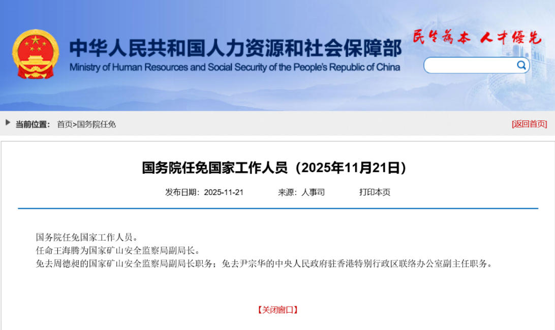人社部網(wǎng)站11月21日消息:國務院任免國家工作人員。任命王海騰為國家礦山安全監(jiān)察局副局長。