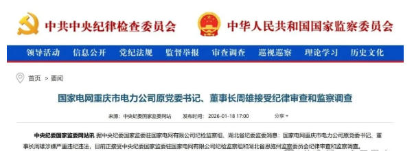 國(guó)家電網(wǎng)重慶市電力公司原黨委書記、董事長(zhǎng)周雄涉嫌嚴(yán)重違紀(jì)違法,目前正接受中央紀(jì)委國(guó)家監(jiān)委駐國(guó)家電網(wǎng)有限公司紀(jì)檢監(jiān)察組和湖北省恩施州監(jiān)察委員會(huì)紀(jì)律審查和監(jiān)察調(diào)查。