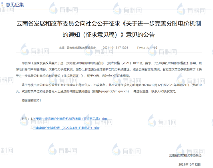 云南發(fā)改委發(fā)布公告《關(guān)于進(jìn)一步完善分時(shí)電價(jià)機(jī)制的通知(征求意見稿)》。電度電價(jià)峰谷價(jià)差維持現(xiàn)行1.5:1:0.5,其中非市場(chǎng)化電量在目錄豐枯電價(jià)基礎(chǔ)上,峰時(shí)段電價(jià)在平時(shí)段基礎(chǔ)上上浮50%,谷時(shí)段在平時(shí)段電價(jià)下浮50%;市場(chǎng)交易電量以當(dāng)月電能量交易價(jià)格為基準(zhǔn),峰時(shí)段電價(jià)上浮50%,谷時(shí)段電價(jià)下浮50%。