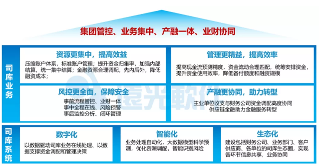 結(jié)合集團(tuán)企業(yè)發(fā)展需求和業(yè)界實(shí)踐經(jīng)驗(yàn),司庫管理體系建設(shè)需滿足“資源更集中、管理更精益、風(fēng)控更全面、產(chǎn)融更協(xié)同”四個標(biāo)準(zhǔn),以數(shù)字化、智能化的司庫管理信息系統(tǒng)為支撐,以“集團(tuán)管控、業(yè)務(wù)集中、產(chǎn)融一體、業(yè)務(wù)協(xié)同”為管理目標(biāo)。